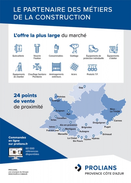 Prolians Provence Côte d'Azur, une enseigne du Groupe Descours & Cabaud. Le partenaire des métiers de la construction. 60000 références disponibles : Quincaillerie, visserie fixation, consommables, outillage, équipements de protection individuelle, équipements d'atelier, équipements de chantier, chauffage sanitaire plomberie, aménagements extérieurs, aciers, produits TP. 24 points de vente de proximité pour professionnels et particuliers : Toulon, Hyères, Grimaud, Puget, Draguignan, Brignoles, Six-Fours… Commandez en ligne sur https://www.prolians.fr/ photos www.lejbm.fr $