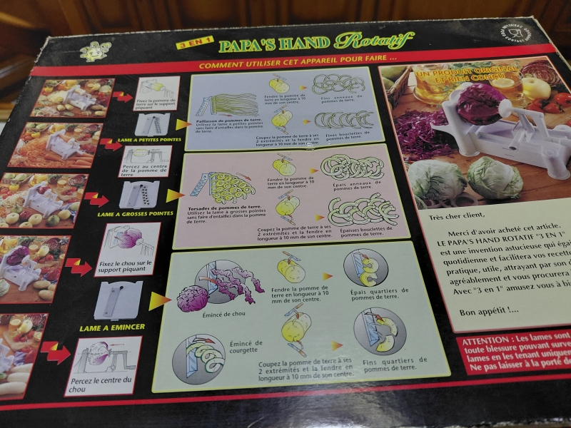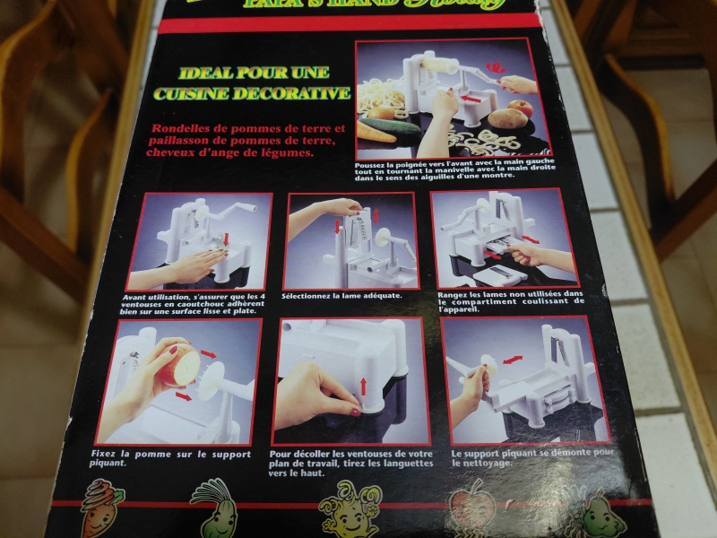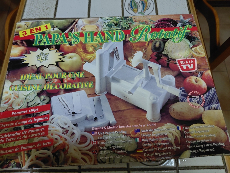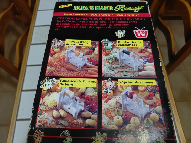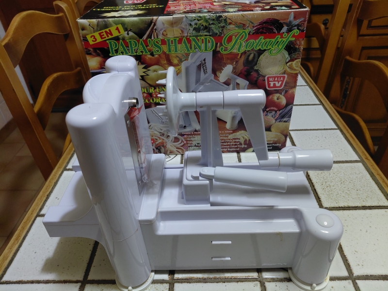 Râpe 3 en 1 Papa’s hand rotatif, pour cuisine décorative. En bon état jamais servi. 10€, 06.68.44.43.20, photos www.lejbm.fr